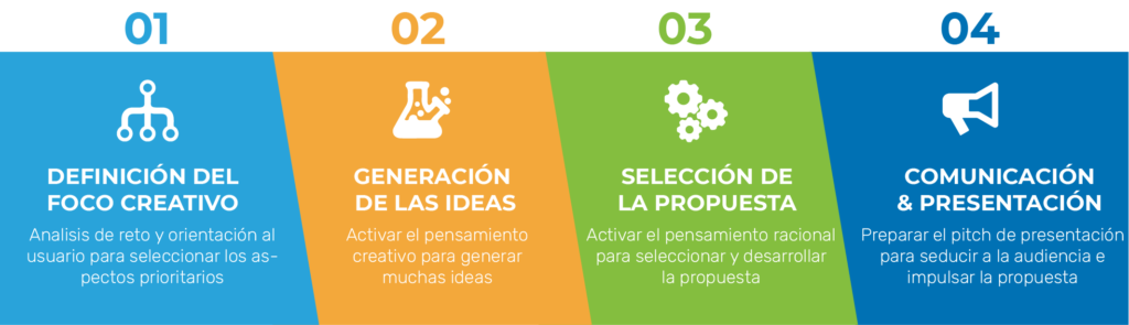 La metodología ha sido desarrollada durante más de 20 años, realizando talleres y formaciones de creatividad para múltiples organizaciones. En el programa IdeasKit vamos a recorrer las 4 etapas del proceso para generar nuevas soluciones: